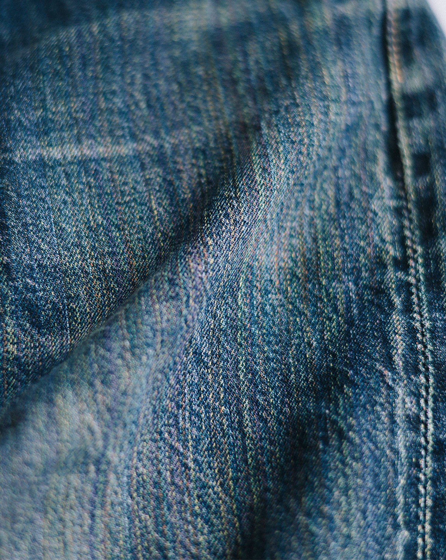 Rainbow denim that changes over time, developing a rainbow hue. A mysterious fabric that transforms from deep indigo to seven colors the more you wear it. It's a special denim that symbolizes Uchida Sewing's craftsmanship, making you look forward to its daily evolution.